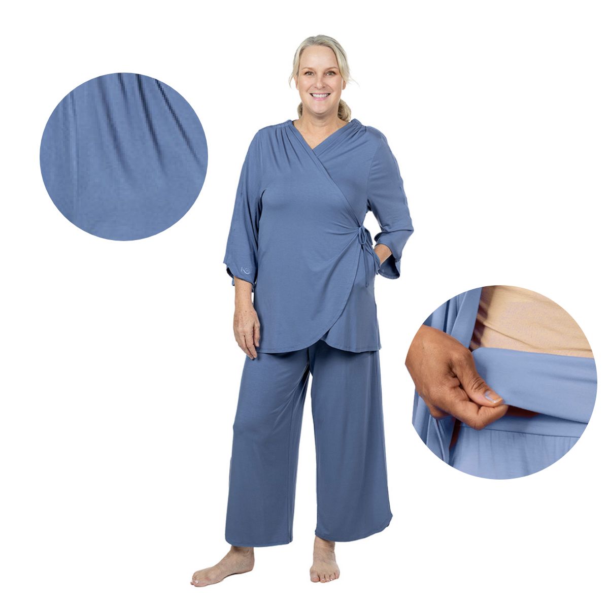 - Recovery at Home - super soft fabric, front wrap design, loose neckline, and snap sleeve for comfort and care of PICCS and ports make these great pajamas to wear at home