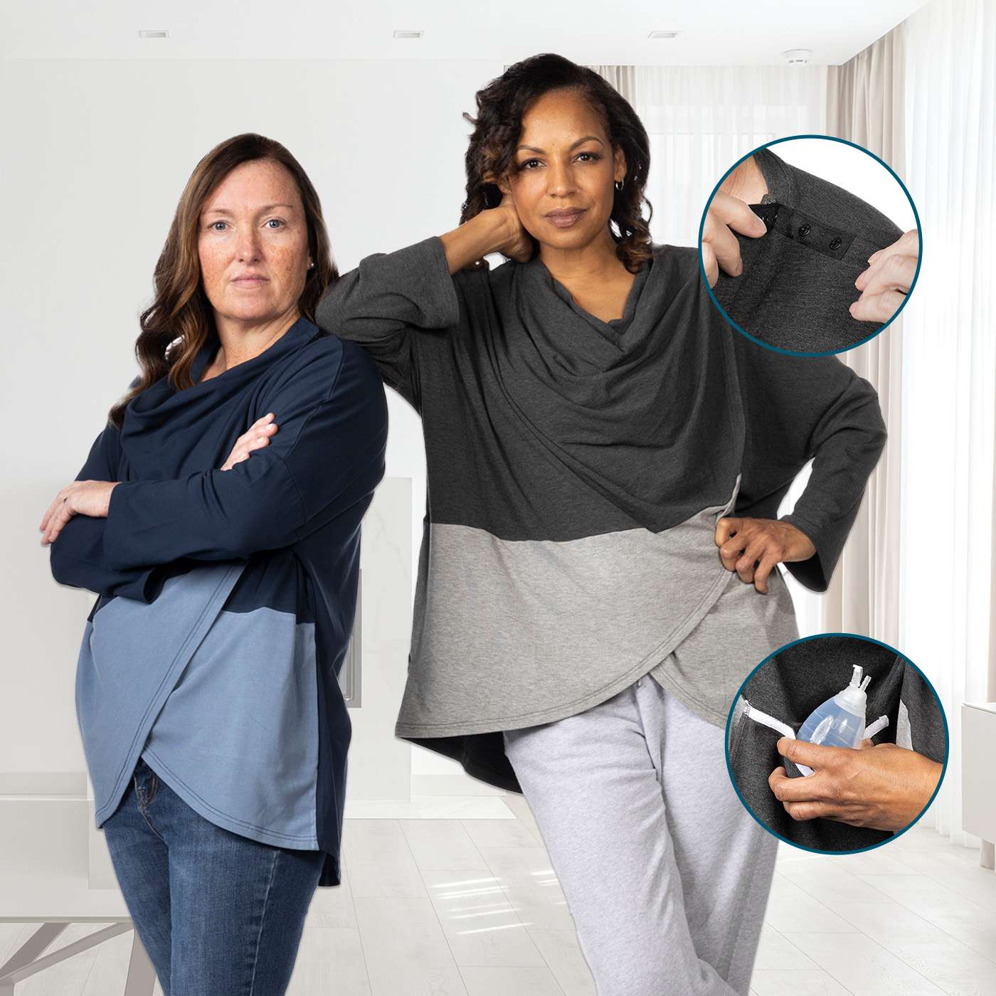 - Hidden, reinforced interior pockets allow for discrete storage of any medical devices or drainage bulbs